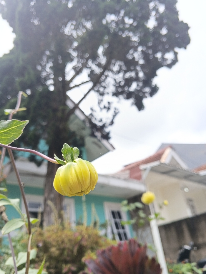 A yellow flower bud hangs on a thin stem in the foreground. Behind it, a blurred evergreen tree dominates the shot. In the background, parts of houses with white walls and brown roofs are visible. The sky is overcast. Other plants with green and red foliage are scattered in the immediate foreground. The flower bud has tightly packed petals.