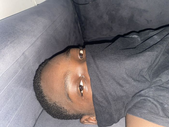 A person lies sideways on a gray upholstered couch, partially obscured by a black t-shirt. Their head is tilted, with only the eyes and a portion of the forehead and ear visible. The skin tone is dark. The shirt drapes across the face, creating shadows. The background is slightly out of focus, but appears to be the couch's texture.