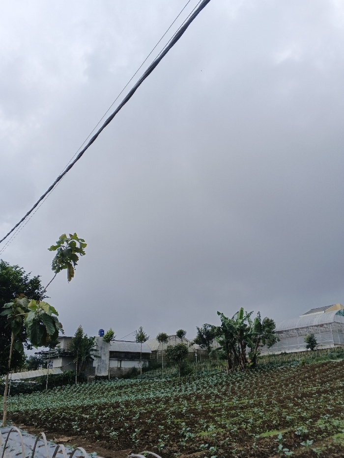 The image displays an agricultural landscape under a uniformly overcast, light grey sky, located in São Félix do Xingu, Brazil. A dark electrical or communication cable, appearing to consist of multiple twisted strands, traverses the upper portion of the frame diagonally from the top-left towards the middle-right. The foreground and midground are dominated by a cultivated field of dark brown soil, densely populated with rows of young, green leafy plants, sloping gradually upwards towards the background. In the bottom-left corner, a partial view of a low-lying structure covered with a white material is evident. Various trees and shrubs are interspersed throughout the scene, notably a cluster of banana trees with broad leaves in the right-center midground. In the background, situated on an elevated terrain behind the field, are several structures. To the left, a multi-story building with light-colored walls and a dark roof is visible, with a blue cylindrical water tank positioned on a lower section of the building or an adjacent structure. To the right, a series of large, arched structures covered with translucent white sheeting, characteristic of greenhouses or agricultural tunnels, extend horizontally across the scene. No individuals or discernible activities are present. The overall lighting is diffused and even, indicative of an overcast day.