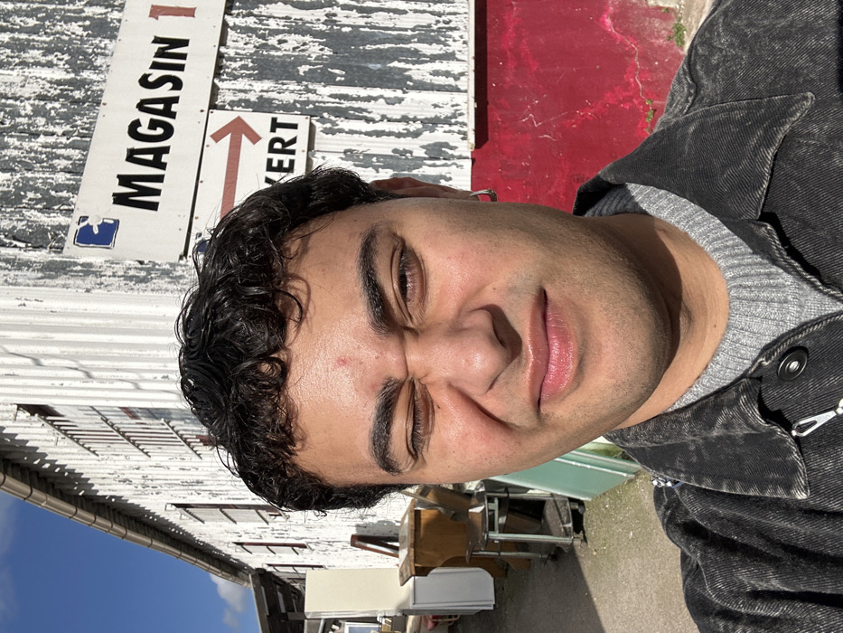 A male individual is depicted in a close-up selfie-style photograph, positioned outdoors under direct sunlight in Neuilly-Plaisance, France