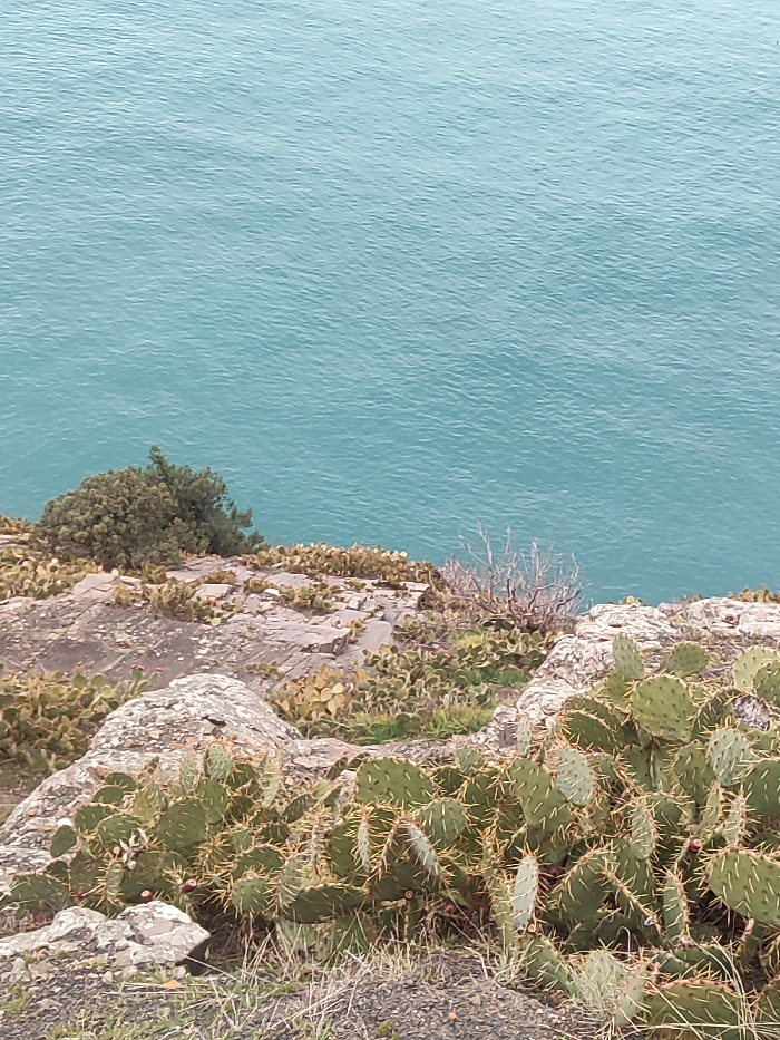 The image displays a panoramic view from a rocky cliff overlooking the sea in Utios, Ukraine. The upper two-thirds of the frame consists of calm, turquoise-blue water, showing subtle ripples across its surface. The lower third features the rugged cliff edge, characterized by grey, stratified rock formations. Clumps of prickly pear cacti (Opuntia species) with visible spines and occasional small reddish fruits or flowers are scattered across the rocky foreground. Patches of dry, sparse grass grow between the rocks and cacti. Further back on the cliff, a dense cluster of green, leafy bushes and a separate, bare, greyish-brown, branched shrub are visible near the drop-off to the sea. No people, animals, or man-made structures are present.