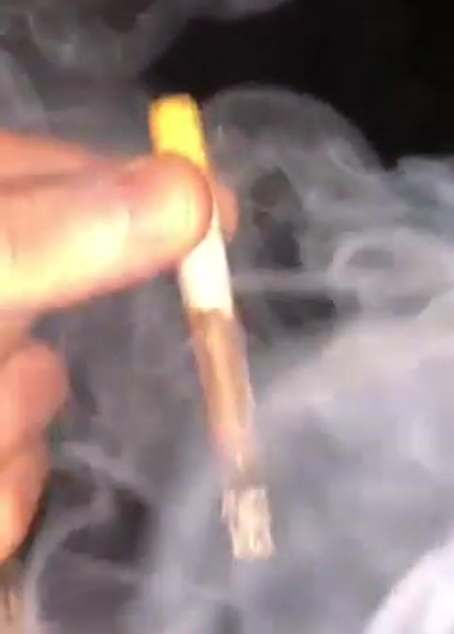 A close-up shot shows a hand holding a lit, partially-smoked cigarette