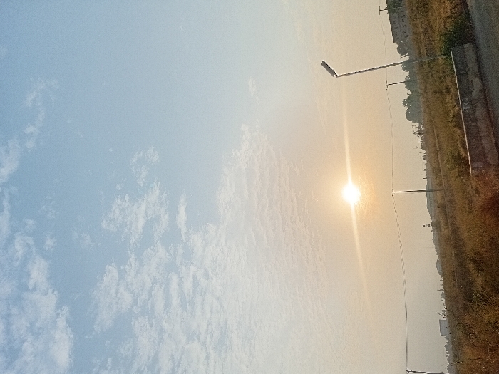A serene landscape features a vast, light blue sky dotted with thin, white clouds. A line of streetlights parallels a rough, overgrown roadside. The sun, a brilliant focal point, radiates a warm glow across the scene, partially obscuring distant buildings. The light creates a hazy atmosphere, softening the details of the landscape.