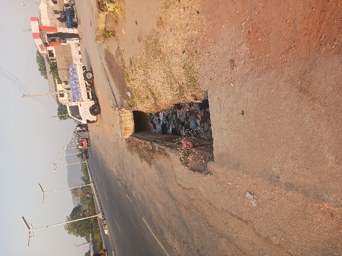 A roadside drain is filled with garbage. The drain is cemented and is situated between the asphalt road and a dirt shoulder. Further down the road, trucks and cars can be seen. Street lights line the road. Mountains are visible in the distance, under a clear sky.