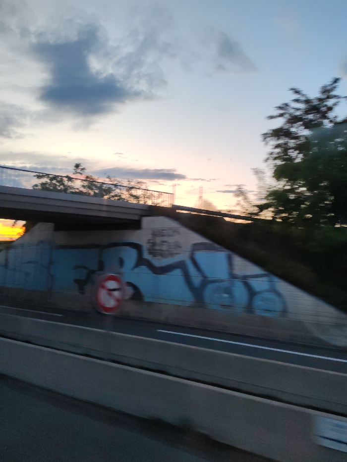 The image displays a roadside scene in Geispolsheim, France, captured from a moving vehicle, evident by motion blur. The sky, indicative of dawn or dusk, features scattered grey clouds against a light blue backdrop, transitioning to an orange and pink hue on the left horizon. A multi-lane paved road with white lane markings and concrete median barriers occupies the lower portion of the frame. To the right of the road, a concrete retaining wall supporting an overhead bridge structure is visible. This wall is heavily adorned with light blue and black graffiti, including stylized letters and the discernible black text "MEON SUGA." A circular red and white prohibitory sign is partially obscured by the graffiti on the lower section of the wall. The bridge structure, with a metal railing, spans above the road. Blurred green foliage from trees is present on the far right.