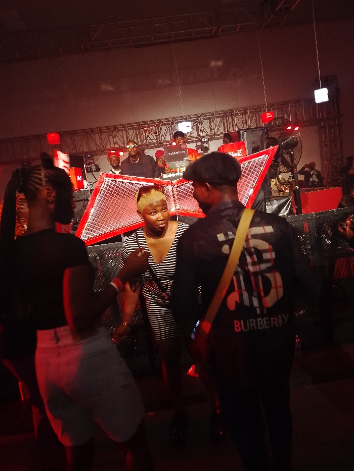 The photograph captures a dimly lit indoor scene with several people present. Dominating the background is a structure with a net-like design illuminated in red. A DJ can be seen behind the structure. In the foreground, three individuals are visible. A woman in a striped dress, another woman with braided hair wearing a black top and denim shorts, and a man with a dark cap and a "Burberry" jacket. The image is somewhat grainy and has a strong red tint.
