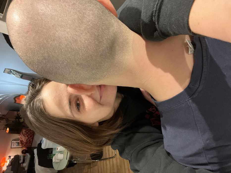A woman with brown hair looks directly at the camera. Above her head is a man with a closely shaved head. He appears to be standing behind her. The woman is wearing a black hoodie, and the man is wearing a dark blue shirt. There is a tag visible on the back of the man's shirt. The background shows a room with furniture and decor. The image has been rotated so that the subjects appear on their sides.