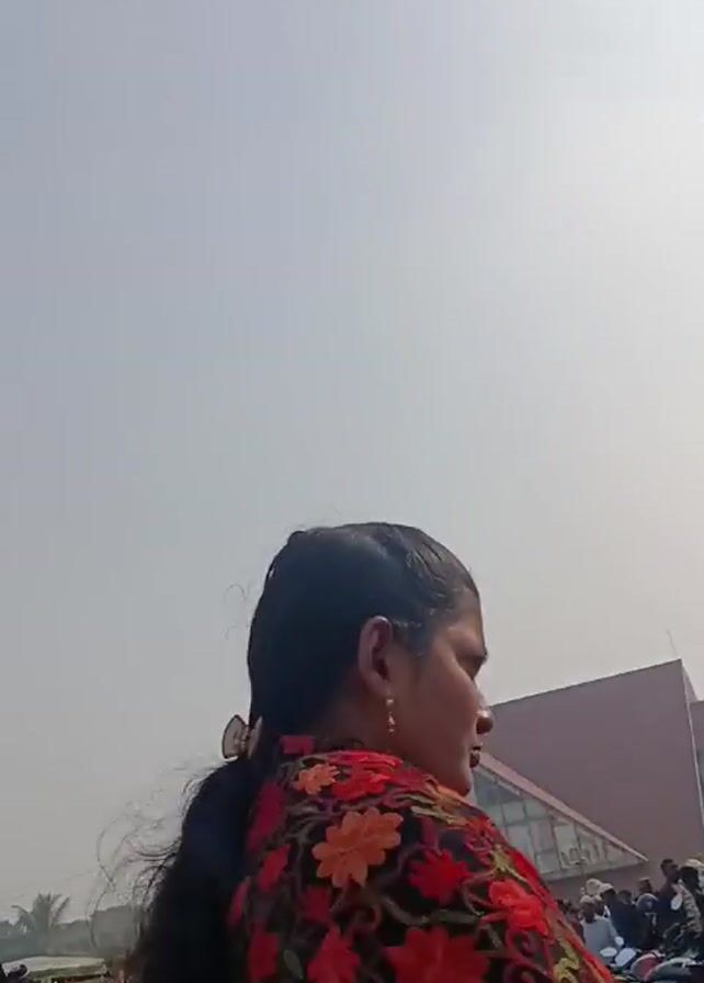 gathering of people outdoors, adjacent to a building with a prominent arched entryway and a roofed structure with a glass facade. Multiple parked motorcycles line the edge of a paved area, separating it from a grassy field where several women are seated on the ground, some wearing hijabs. A few men are seen walking around and engaging with the parked motorcycles. The overall atmosphere appears to be that of a public event or gathering. The weather seems overcast.