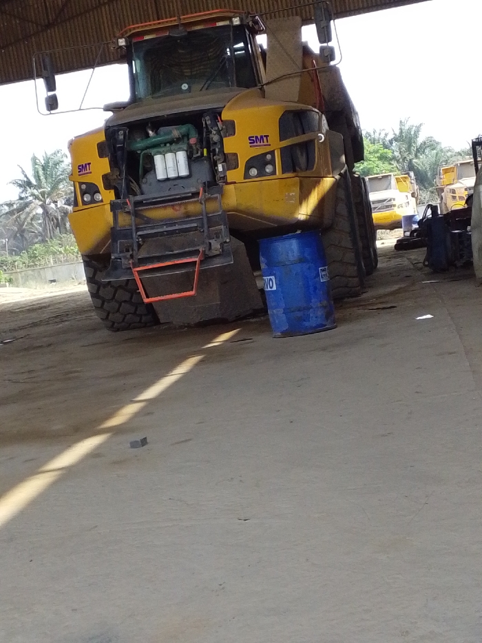 A large, yellow Volvo articulated hauler with the hood open, revealing the engine, is parked indoors. The hauler has "SMT" logos on either side and a set of steps at the front. A blue barrel is positioned under the front of the hauler. Other trucks are visible in the background. The indoor space appears to be a garage or workshop with a concrete floor and metal roofing. Strong sunlight casts shadows across the floor.