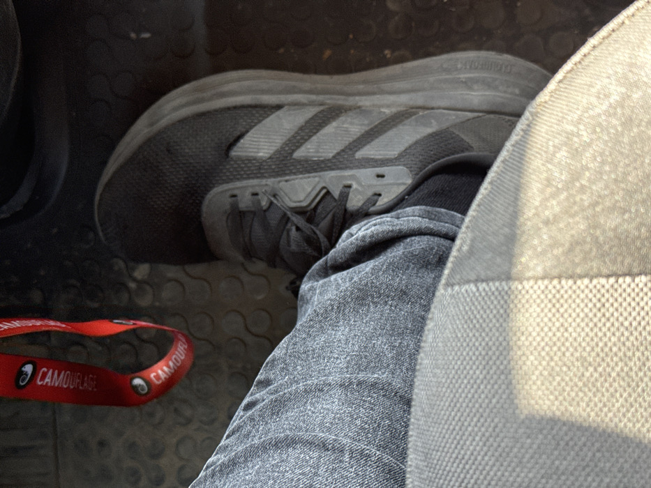 The scene captures the interior of a vehicle. While the image provides no visual cues to confirm a specific location within Sofia, Bulgaria, it depicts a close-up view of an individual's lower right leg and foot. The person is wearing dark grey denim jeans, a black sock, and a black athletic shoe with three dark grey stripes, resembling an Adidas brand design. The shoe features a mesh upper and a visible "CLOUDFOAM" imprint on the sole. The foot rests on a dark-colored rubber car floor mat with a repeating circular texture, which appears to have some dust or debris. In the upper left quadrant, a red lanyard with the white text "CAMOUFLAGE" and an ASICS logo is visible, lying coiled on the floor mat. A portion of a light grey, textured fabric car seat, likely belonging to the vehicle, is visible in the foreground, with sunlight illuminating parts of its surface. No direct interaction is occurring, only the static placement of the leg and objects within the vehicle cabin.