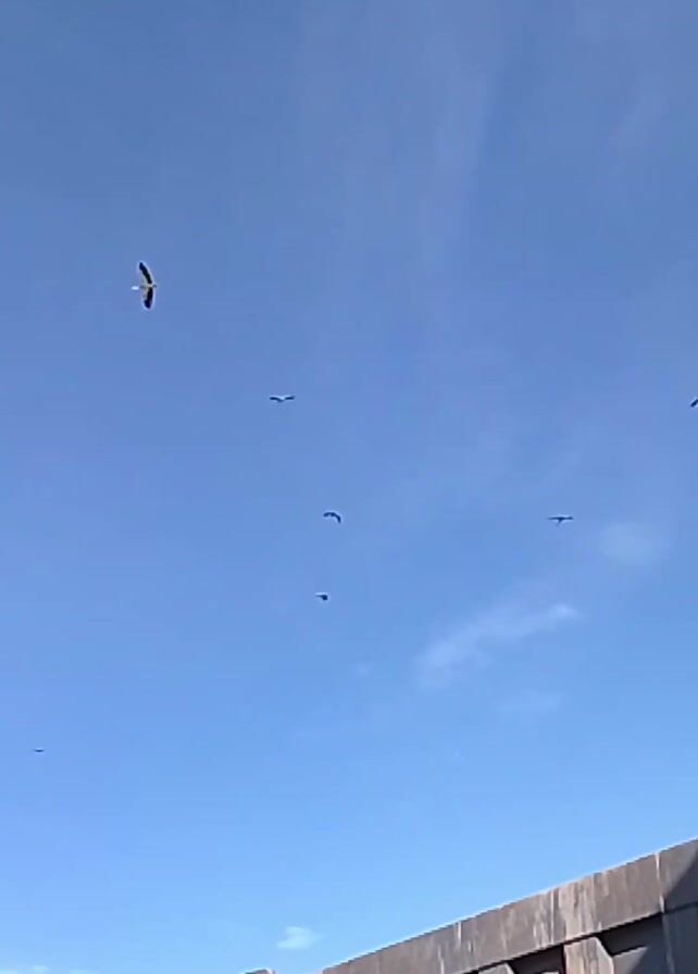 low-angle view of a clear blue sky with several birds soaring in the air. In the foreground, the top portion of a large, gray rectangular structure is visible. The birds are scattered across the frame, appearing as dark shapes against the bright sky. The camera angle is slightly tilted upwards, focusing on the birds in flight and the expansive sky above. There are a few faint clouds in the sky.