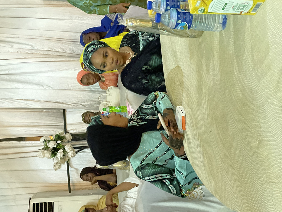 Several women are seated around a table, wearing traditional attire. The woman in the foreground wears a green and black patterned dress with a black headscarf, holding a pen over an open notebook. Other women are dressed in various colors including blue, yellow, and peach. Bottles of water and a box of juice are on the table. In the background, white drapes and floral arrangements can be seen.