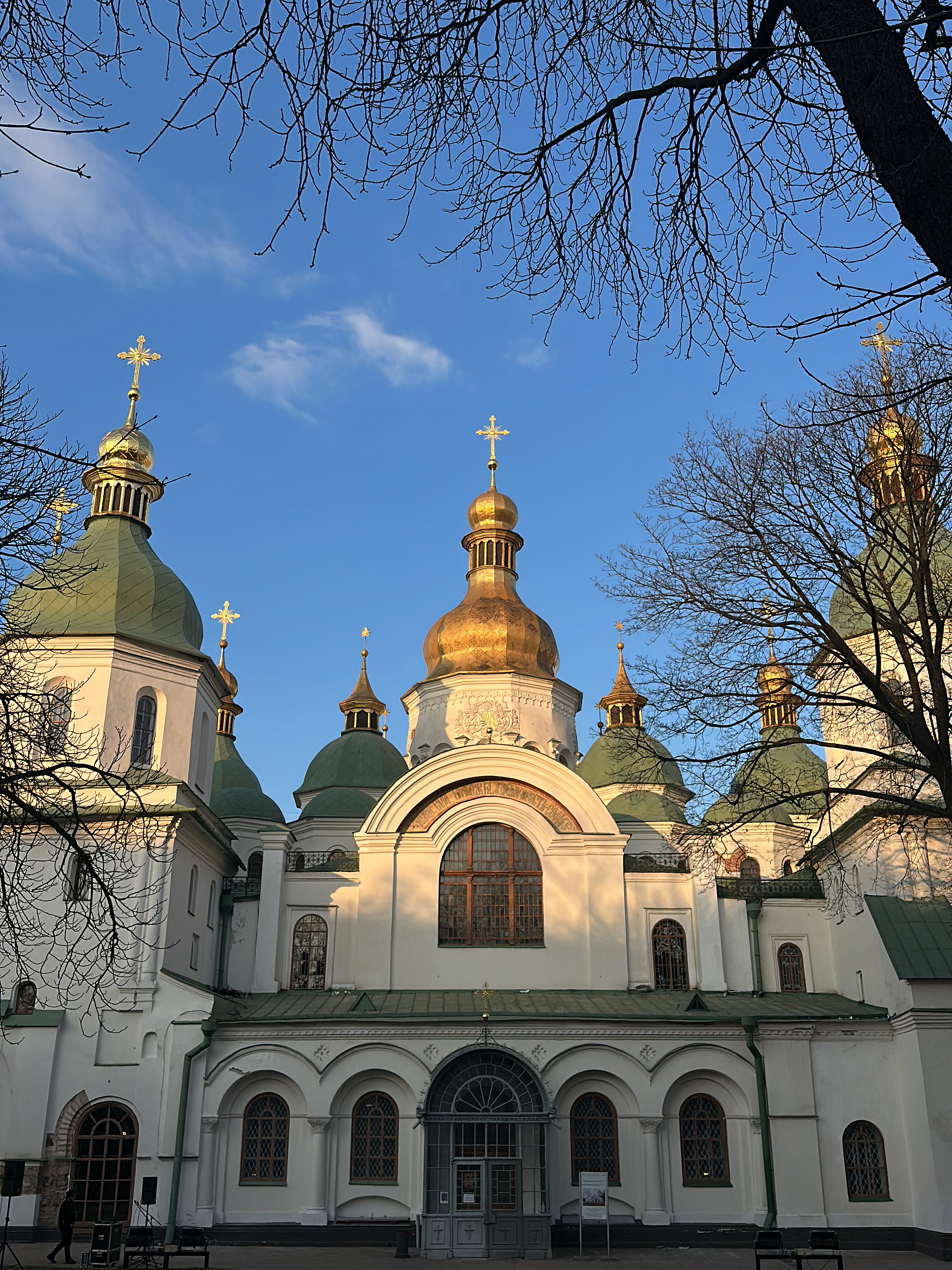 The image depicts the Saint Sophia Cathedral in Kyiv, Ukraine, viewed from its front courtyard. The cathedral features a white facade with multiple golden onion-shaped domes and green tented domes, each topped with a golden Orthodox cross. A large, prominent golden dome stands centrally, surrounded by smaller green domes and additional golden domes. The building's architecture includes numerous arched windows, with a large arched window situated above the central main entrance, which is recessed. Green decorative elements or roofing are visible along the lower sections of the structure. The sky is clear and blue with scattered wispy clouds, visible through the bare branches of deciduous trees that frame the upper portion of the cathedral. The sunlight illuminates the facade, casting warm tones and highlighting the golden domes, indicating a late afternoon or early morning setting. In the lower-left foreground, a dark-clothed individual is partially visible, standing near dark rectangular objects that resemble speakers or equipment on the paved ground. A sign or informational display board is present near the central entrance doors. No direct interactions are visible.