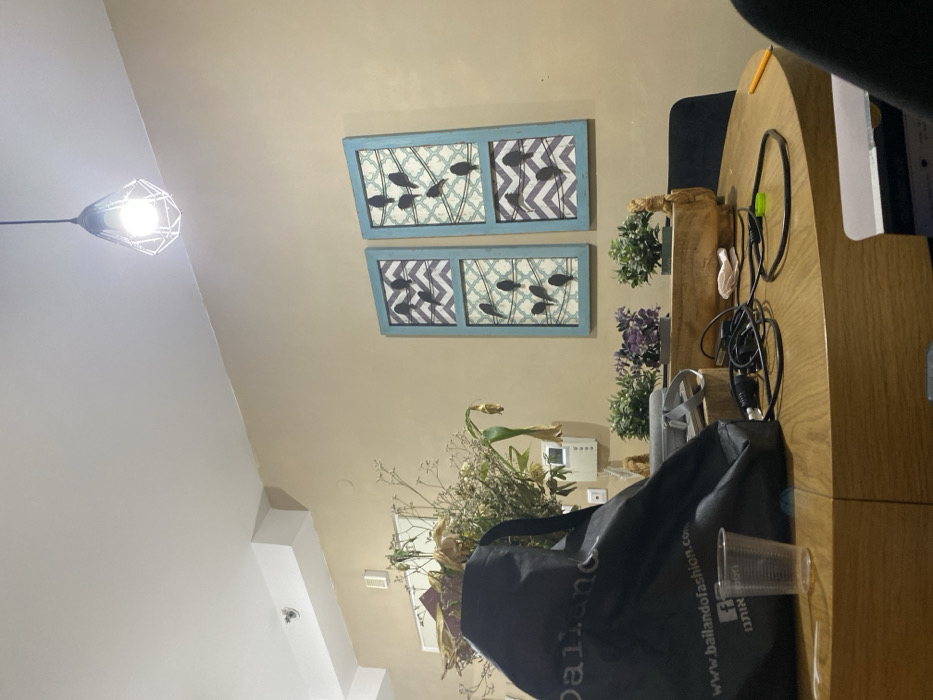 The image depicts an indoor scene, likely a commercial establishment or office space, located in Rishon LeZion, Israel. This location is identified by "Bailando" branding visible on a black tote bag, with associated Hebrew text translating to "Fashionable Clothing" and "www.bailandofashion.com", which corresponds to a business in Rishon LeZion. The scene is dominated by a large, round, light wood-toned table that occupies the foreground and midground. On the left side of the table, a black tote bag prominently displays "Bailando", "www.bailandofashion.com", a Facebook logo, and Hebrew text "לבוש אופנתי" (Fashionable Clothing) in white lettering. Adjacent to the bag is a clear, empty plastic cup. Behind these items, a vase holds a large arrangement of dried or wilting flowers and foliage. To the right of the floral arrangement, a wooden decorative bowl contains two small artificial potted plants; one features green foliage, and the other has purple flowers. Scattered on the table surface near the plants are tangled black cables, a small piece of white tissue, and the tip of a yellow pencil or pen. A dark-colored chair is partially visible on the right side of the table, and a small portion of dark clothing, possibly a leg, is visible in the bottom right corner, indicating a person is seated at the table. The background consists of a beige-colored wall adorned with two vertically oriented rectangular decorative wall hangings. Each piece features a light blue frame enclosing two panels, one with a purple and white chevron (zigzag) pattern and the other with a teal and white lattice pattern. Silhouettes of black birds perched on wires are depicted across these patterned panels. Below the floral arrangement, a white intercom or control panel is mounted on the wall. A rectangular white protrusion extends from the white ceiling on the upper left, while a single bright ceiling light fixture with a geometric metal cage design illuminates the scene from the upper right.