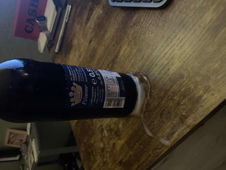 A dark brown glass bottle of "Dortmunder Pilsener" beer, marked with a crown logo, "e 0,5 l", "Alk. 4,8%", and a "VEGAN" certification, stands upright on a light-brown wooden desk or table. The label explicitly states "DORTMUNDER KRONEN ist Liebe und Stolz zu unserer Heimatstadt," directly linking the beer and its origin to Dortmund, Germany. A clear, frothy liquid has leaked from the base of the bottle, forming a wet puddle beneath it and trailing across the wooden surface to the left. In the background, to the left, a grey desk holds papers and a framed picture. To the right, a red box labeled "CASH," a silver wristwatch, a white notebook, a silver pen, and a portion of a dark computer keyboard are visible on the wooden surface. No individuals are present.
