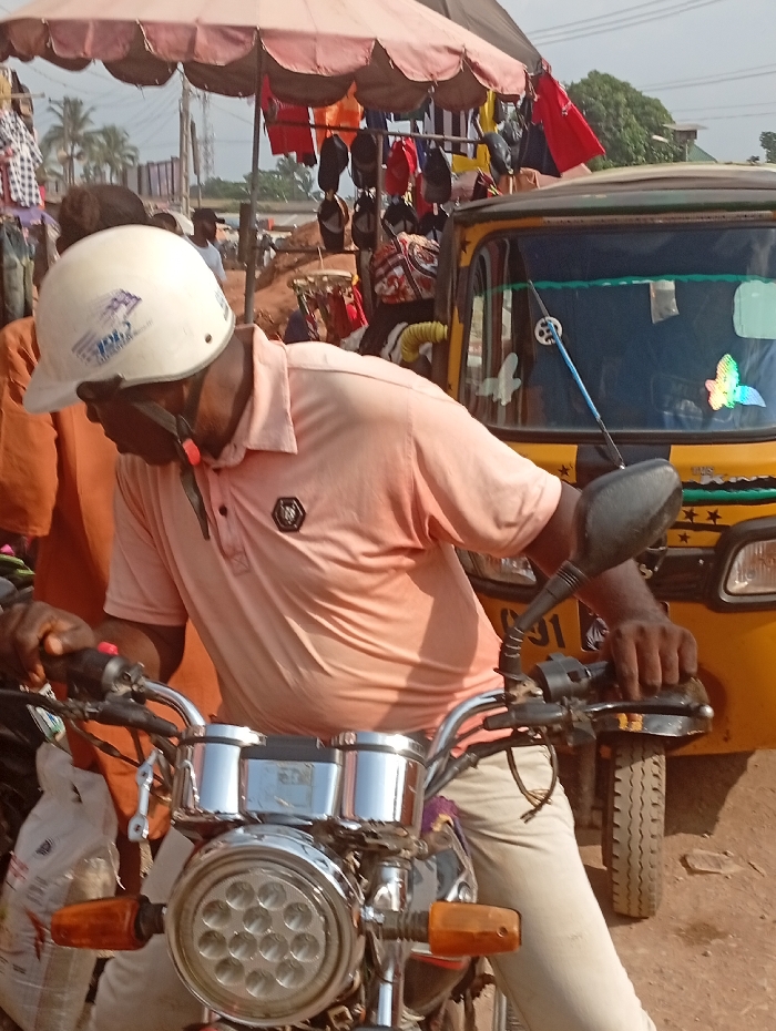 An outdoor market or street scene in Nnewi, Nigeria, is depicted under daylight conditions. The foreground features an adult male, dark-skinned, wearing a light peach polo shirt with a dark emblem on the left chest, light-colored trousers, and a white safety helmet with blue markings. He is positioned on a motorcycle, gripping the chrome handlebars. The motorcycle's front is visible, featuring a circular, chrome-rimmed headlight with multiple LED lights and orange indicator lights on either side. A white bag hangs from the left side of the motorcycle near the front wheel. In the mid-ground, immediately behind the motorcyclist, another individual in an orange shirt is partially visible. To the right, a yellow Keke Napep (auto-rickshaw) is stationary, displaying a blue and white ornamental antenna and two holographic butterfly stickers on its windscreen, along with black star decals on its yellow body. A tire and part of the Keke Napep's frame are visible. The background shows a busy market environment. A large, reddish-brown market umbrella or canopy shades an array of displayed goods, including various items of hanging clothing (shirts, trousers, dresses) and footwear. Other market items, possibly drums, are also present. The ground throughout the scene is reddish-brown dirt. Distant palm trees and vague building structures are discernible against a light sky.