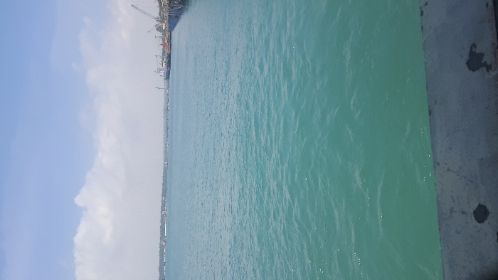 The image displays a wide view of Kilindini Harbour in Mombasa, Kenya, specifically within or adjacent to the Ganjoni/Shimanzi ward. The foreground features a dark, weathered concrete or metal barrier, suggesting a viewpoint from a pier or elevated platform. The central and mid-ground consist of a large body of turquoise-blue water with visible ripples, indicating movement. In the background, to the left, a distant landmass with faint structures and vegetation is present under a hazy sky. To the right, a commercial port is clearly visible, featuring multiple large cargo ships docked at a wharf, serviced by several tall gantry cranes and other industrial structures. The sky is partly cloudy with patches of white cumulus clouds against a light blue backdrop. No individuals are discernible within the frame. The scene is illuminated by daylight.