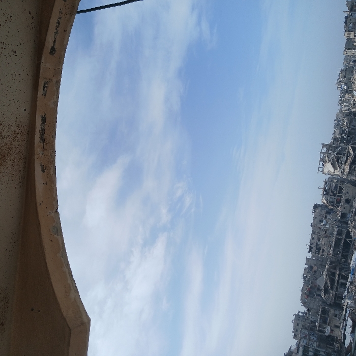 The image displays a wide, elevated view of the city of Gaza, Palestinian Territory, framed in the immediate foreground by a weathered, light-colored concrete archway. The upper half of the composition features a clear blue sky with sparse, wispy white clouds. Below the horizon, the urban environment is characterized by extensive structural destruction. Numerous multi-story residential and commercial buildings are depicted as heavily damaged or reduced to rubble, exhibiting collapsed sections, exposed concrete and rebar, and scattered debris across the scene. No people, active movement, or discernible interactions are visible within the damaged urban landscape under the daytime sky.