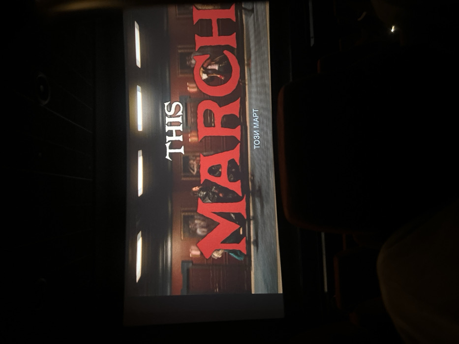 The image depicts a movie screen displaying a title card within a darkened cinema hall. The screen shows the English text "THIS" in white above "MARCH" in large, stylized red letters. Below the red text, the Bulgarian equivalent "ТОЗИ МАРТ" (THIS MARCH) is visible in smaller white font. The background of the screen content features a dimly lit, ornate interior, possibly a hallway or gallery, with dark reddish-brown walls adorned with framed pictures. Several figures are partially visible behind and within the red letters: one figure in lighter attire on the left, another bearded figure in dark clothing near the center, and a third figure in light-colored clothing appearing to fall or be in distress on the right. Overhead rectangular lights are visible on the ceiling within the displayed scene. In the immediate foreground, dark cinema seats with reddish-brown upholstery are partially visible, indicating the perspective of an audience member. A section of a person's lap or leg, covered in dark fabric, is present in the lower-left corner. The setting is a commercial cinema in Plovdiv, Bulgaria.