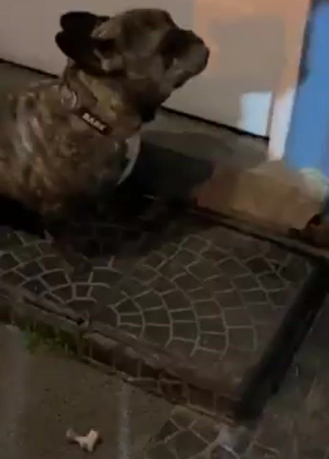 brindle French bulldog sitting on a tiled area in front of a white door. The dog is wearing a red collar that reads "BARK." The dog looks around, and then the camera abruptly moves closer to the dog and stops.
