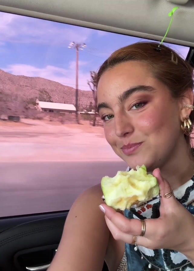 A woman is sitting in the back of a car, holding an apple that has been mostly eaten. She has multiple rings on her fingers and hoop earrings. The background is out of focus, but it appears to be a desert town. The car is moving. She looks at the apple, and then up and to the side. She then smiles at the camera. There is music playing.