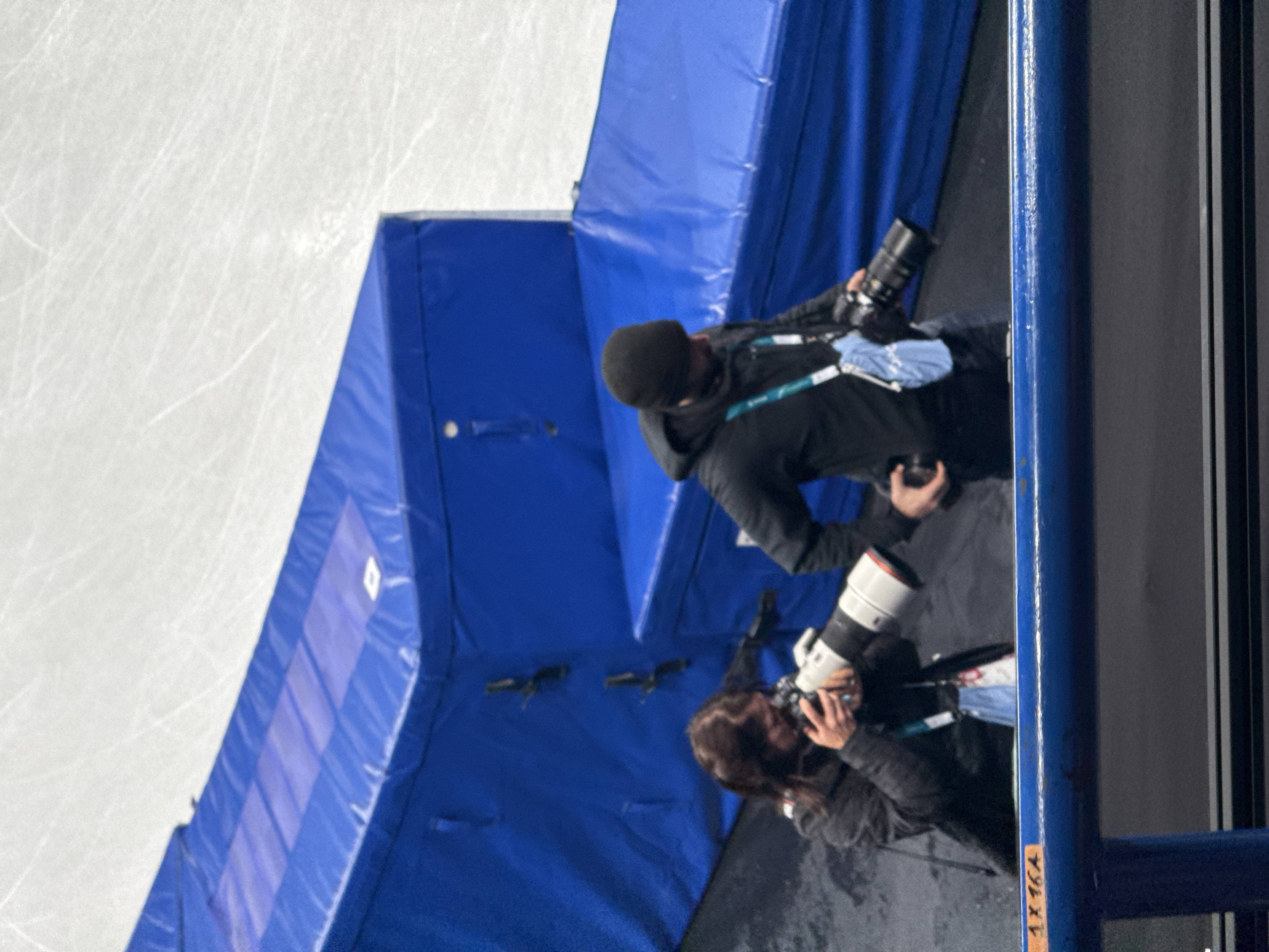 Two photographers are positioned at the edge of an ice rink. One, wearing a black beanie and jacket, holds a camera with a telephoto lens. The other, with long brown hair, operates a larger camera. They are near padded blue walls bordering the rink, with an expanse of ice visible. A blue metal structure is nearby, obscuring a portion of the scene.