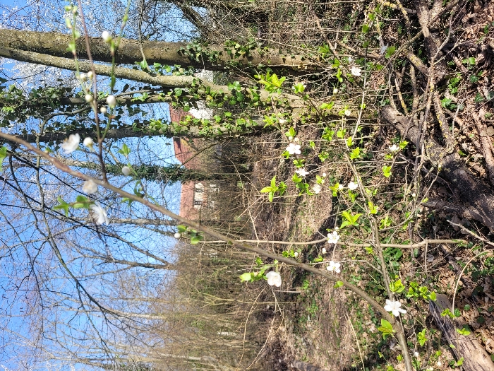 The image displays an outdoor scene within a wooded area, bordering a residential zone, in Ifs, France, under a clear blue sky. The foreground features a branch adorned with multiple white five-petaled blossoms and nascent light green leaves, extending horizontally. The ground level comprises fallen leaves, twigs, and bare earth, interspersed with several decomposed logs. The midground contains numerous deciduous trees, primarily bare, with some trunks on the right exhibiting dense growth of green ivy. In the background, a residential structure with light-colored walls and a reddish-orange tiled roof is partially visible through the trees. No individuals or specific actions are depicted within the frame. The lighting suggests bright daylight, and the botanical elements indicate early spring conditions.