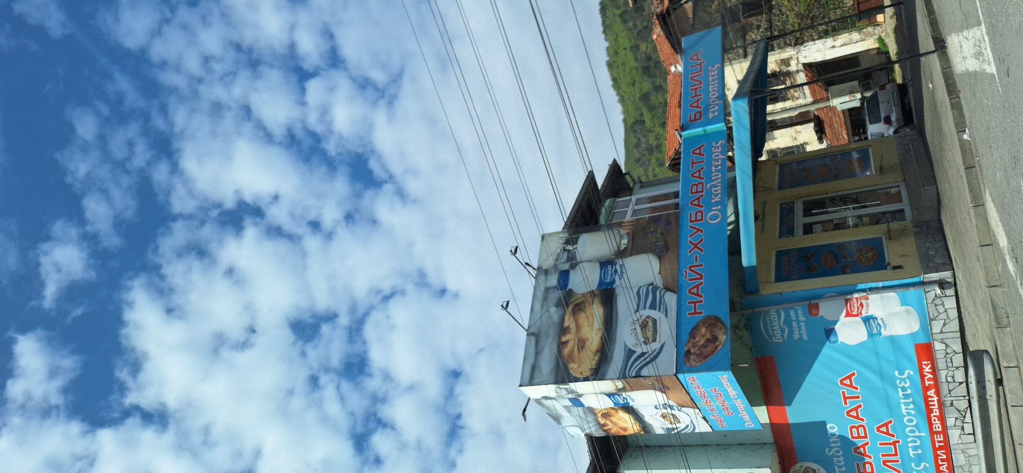 The image depicts a street scene in the city of Kresna, Bulgaria. The focus is on a bakery or pastry shop adorned with multiple large blue banners advertising "НАЙ-ХУБАВАТА БАНИЦА" and "БАВАТА ИЦА" in Cyrillic script, translating to "The best Banitsa" and "Bavata Itsa". These banners prominently feature images of cheese pastries ("tyropites") and dairy products (yogurt or ayran) by the brand "Балкан". The shop itself has a yellow facade with windows decorated with pictures of pastries. A man is sitting inside the shop, partially visible behind the window. The background includes a building with a red-tiled roof, green trees, and a blue sky with scattered clouds. Electrical wires span across the upper portion of the image. The photograph appears to be taken from the street, suggesting it's a view captured while standing or walking by.