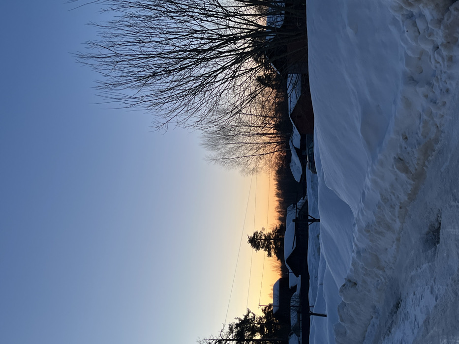 This image depicts a winter scene in the city of Раздолье, Russia, at dusk or dawn. The sky, occupying the upper half, transitions from a clear, pale blue at the zenith to a bright orange-yellow near the horizon. The foreground features a snow-covered, unpaved road or path on the left, exhibiting tire tracks and patches of ice and slush. Deep snowdrifts line both sides of this path, forming undulating white mounds across the lower half of the frame. In the mid-ground, several single-story wooden structures, characteristic of rural housing, are visible, their dark facades contrasting with snow-laden roofs. A dark-colored vehicle is partially obscured by snow near one of these houses on the right-center. Overhead power lines traverse the mid-ground. The background consists of a dense forest line, primarily composed of bare deciduous trees and some coniferous trees, silhouetted against the colorful sky. No individuals or active subjects are visible within the frame.
