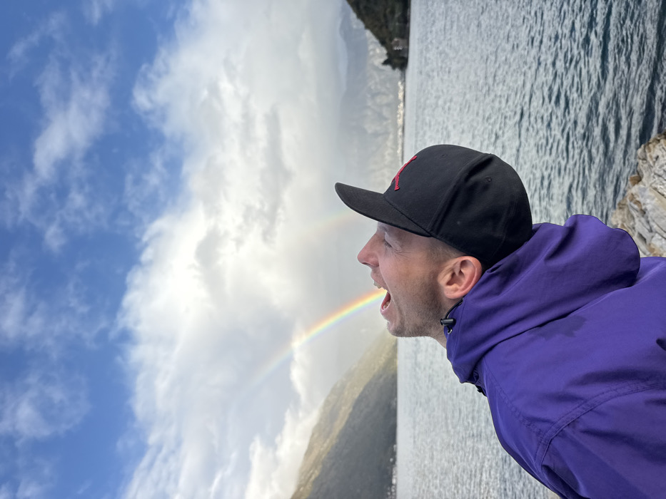 A male individual is depicted in the foreground of an outdoor scene in Đurići, Montenegro, situated by a body of water consistent with the Bay of Kotor. He wears a dark purple hooded jacket and a black baseball cap featuring a red logo. The subject's head is tilted sharply backward, with his mouth wide open, directed towards the sky. Directly above him, a vibrant, multi-colored primary rainbow arcs across the partly cloudy sky, with a fainter secondary rainbow visible parallel to it. The primary rainbow's visible arc appears to descend towards the area directly above the subject's open mouth. The background features calm water extending to the base of steep, vegetated mountains on both the left and right sides. Distant buildings are discernible along the mountain base on the right shore. The sky is partially covered by white and grey clouds, with patches of blue visible. Light-colored rocks are visible in the immediate foreground at the water's edge.