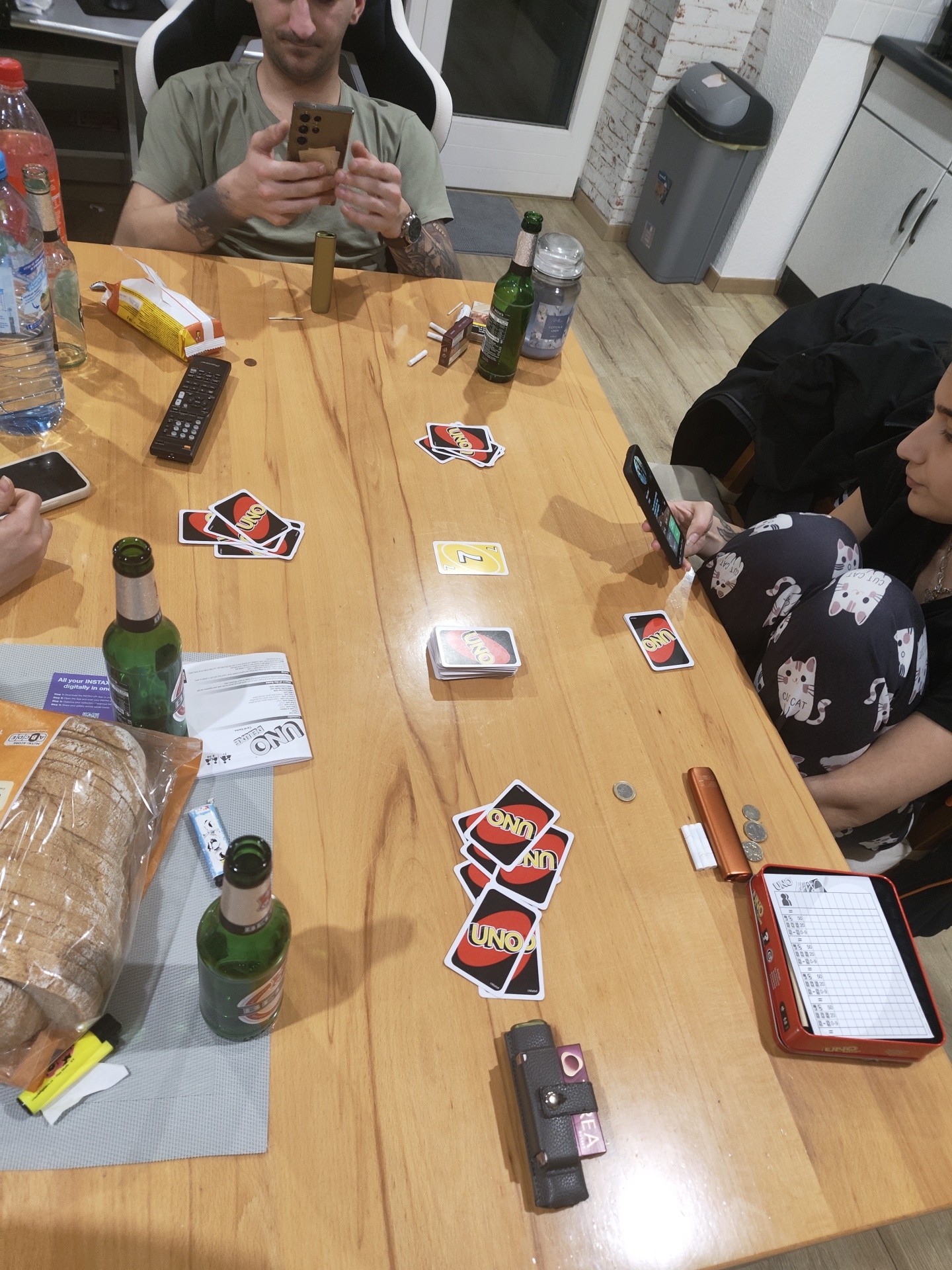 The scene is set indoors within a residential dwelling in Leidersbach, Germany, specifically in a room appearing to be a kitchen or dining area. A light-colored wooden rectangular table occupies the central foreground. The flooring consists of light laminate wood planks. In the background to the right, white kitchen cabinets with silver handles and a grey trash can with a black lid are visible against a white wall. To the left, a section of a wall features an exposed brick pattern, and a white and black gaming chair is partially visible. Three individuals are present. A male subject is seated on the left in the gaming chair, wearing a green short-sleeved t-shirt and displaying tattoos on both forearms. He holds and views a gold-colored smartphone with both hands. A female subject is seated on the right, wearing a black top and black leggings patterned with white cartoon cats and text. She holds and views a black smartphone with her left hand; a tattoo is visible on her right forearm. Another person's hands, holding a black smartphone, are visible at the lower-left edge of the table. The table is extensively covered with objects. These include multiple stacks and individual UNO playing cards scattered across the surface, along with a red metal tin containing a white UNO score sheet detailing numerical entries like "50," "20," and "=". A black remote control with numerous buttons lies near the center. Beverages present include a large plastic bottle of clear water, another plastic bottle containing a reddish liquid, an empty clear glass bottle, and two green glass bottles. Food items consist of a transparent plastic-wrapped loaf of bread on a grey placemat, a white and yellow packaged snack, and a small blue and white candy wrapper. Personal items include a gold cylindrical object, an orange elongated electronic device, a black leather-like pouch containing a purple electronic device, a pack of cigarettes with several loose cigarettes, a grey lidded jar, a yellow highlighter pen, and a collection of Euro coins, including a single 1 Euro coin and a small pile of smaller denominations. A white paper sheet with "UNO" rules or instructions is also on the table.