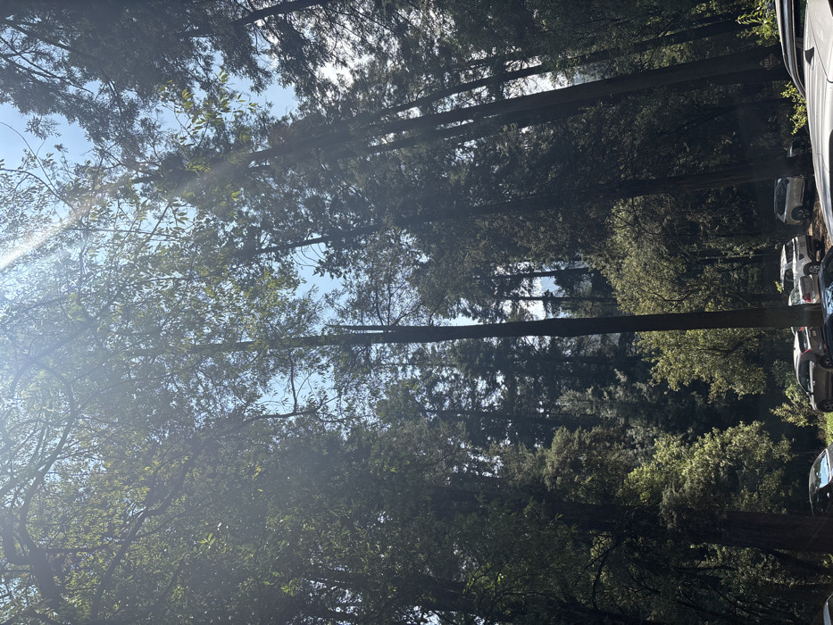 The scene depicts a sunlit forest in the city of Unknown, Mexico. Numerous tall, dense coniferous and deciduous trees dominate the vertical frame, with bright sunlight streaming through the canopy, causing lens flare visible in the upper sections against a clear blue sky. In the lower third of the image, approximately eight passenger vehicles, including multiple SUVs and sedans in dark, white, and silver tones, are parked in what appears to be an unpaved area amidst the trees. Distant mountains or hills are faintly discernible through the tree line in the mid-ground. No individuals are visible.