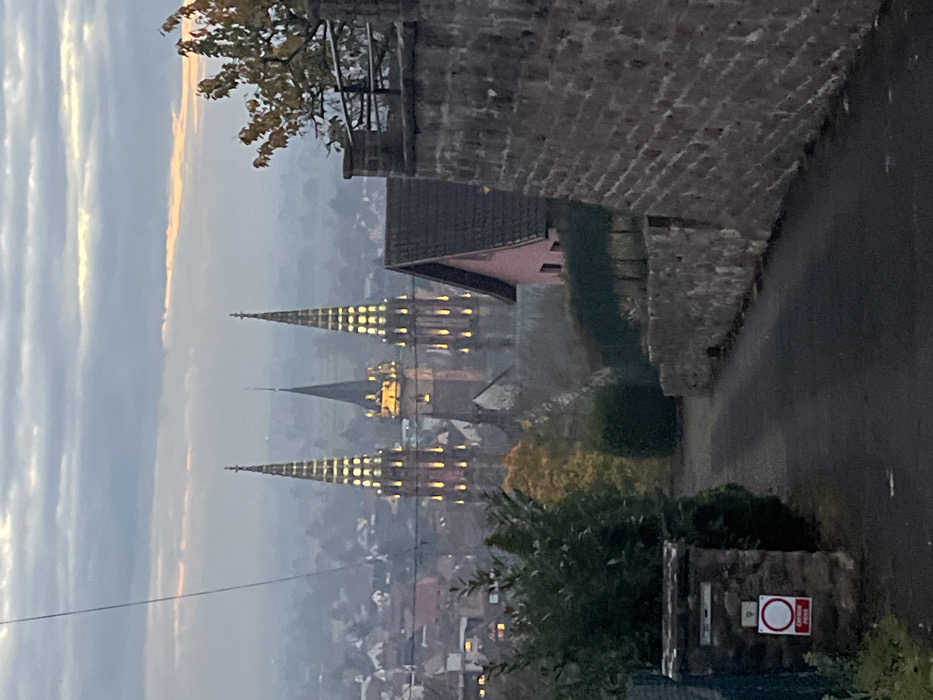 An elevated view captures a misty twilight or early morning scene in Obernai, France. In the far background, under an overcast sky with a faint horizon band of pale orange light, three illuminated church spires dominate the skyline. Two tall, slender spires, belonging to the Church of Saints Peter and Paul, stand prominently with vertical rows of yellowish lights, flanking a slightly shorter, broader central spire also lit. Below these, the hazy expanse of Obernai's rooftops and buildings is visible, dotted with faint artificial lights. Beyond the town, a flat, misty landscape extends to the horizon. In the foreground, a dark, narrow paved path, identified as a "CHEMIN PRIVE" (Private Road) by a red and white circular sign affixed to a stone pillar, curves uphill from the lower center. To the left of the path, dense green foliage, including hedges and trees, lines the ascending terrain. The stone pillar in the lower left corner also displays the number "9" and likely functions as a mailbox support. To the right of the path, a substantial stone wall, constructed from rough-hewn blocks, runs diagonally, ascending alongside the path. Above this wall, a dark-roofed house with pink-colored walls is partially visible, behind which a section of metal railing and a small tree with autumn-colored foliage are present. No people, animals, or vehicles are observed within the frame. A thin wire traverses the upper left quadrant of the sky.