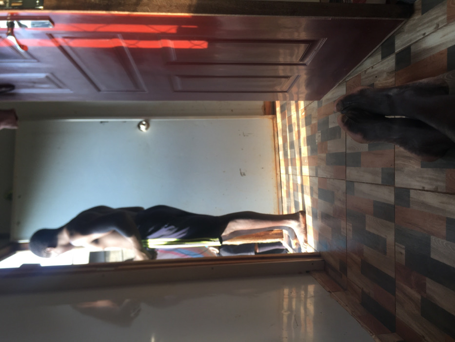 An indoor scene, contextually identified as Riana ward, Kenya. The perspective is low, revealing the crossed, dark-skinned feet of an individual in the immediate foreground. To the right, a dark red paneled door is ajar, casting distinct vertical shadows across the floor. The floor is tiled with a patterned surface featuring rectangular shapes in tones of brown, grey, and black. Through an open, light-colored doorway on the left, a shirtless dark-skinned male is visible, standing with his back to the viewer, wearing dark shorts with a light vertical stripe on the side. A faint reflection of his upper body is present on a reflective surface to the left of the doorway. Partially obscured behind him, the lower legs of a second individual are discernible. Beyond the figures, a plain light-colored wall with a metallic door handle is visible. Strong, directional sunlight illuminates the area through the open doorway, creating sharp patterns of light and shadow on the tiled floor.