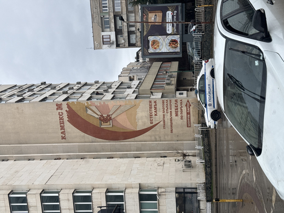 The image displays an urban street scene in Sofia, Bulgaria, specifically near Boulevard "Bulgaria" No. 49, as indicated by the prominent "КАМЕКС М" and "ЕСТЕСТВЕН КАМЪК" (Natural Stone) mural. The foreground is occupied by the hood and windshield of a white passenger vehicle, with its wipers in a resting position. Ahead and slightly to the left, a white Bulgarian police patrol car, marked with "ПОЛИЦИЯ" and blue roof lights, is positioned on a wet asphalt street. The street reflects ambient light, indicating recent precipitation. To the left, a multi-story building with a light-colored facade features a large, stylized mural in earthy tones, depicting an abstract design alongside text. The text "КАМЕКС М" is at the top, and below, "ЕСТЕСТВЕН КАМЪК" is followed by a list: "ГРАНИТНИ ПЛОТОВЕ" (Granite Countertops), "СТЪПАЛА" (Stairs), "ОБЛИЦОВЪЧНИ ПЛОЧИ" (Cladding Slabs), "МЕБЕЛИ ПО ПОРЪЧКА" (Custom Furniture), and "ШОУРУМ - ПАРТЕР" (Showroom - Ground Floor) with a right-pointing arrow. This building exhibits numerous windows and external air conditioning units. A small, bare tree stands near its base, behind a white metal railing and a low stone wall. To the right of the main building, another multi-story residential or commercial structure, appearing older with varied window styles, is visible. Further right, a large outdoor billboard displays images of prepared food dishes (likely Italian pasta) and the website "romanebene.bg" with the Bulgarian text "Да поканим Италия вкъщи?" (Shall we invite Italy home?). Several other vehicles are parked or moving in the background, partially obscured by the billboard and other structures. The sky is overcast. A yellow traffic bollard is visible on the far left.