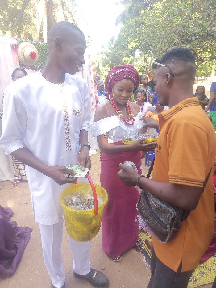 A woman in a maroon skirt, ornate white top, and matching headwrap holds a plate of food. Two men flank her, one in a white outfit dropping money into a yellow bucket. The other man in an orange shirt offers her a wrapped food item. People are seated in the background, observing the scene. A decorated archway is visible in the background. The event takes place outdoors, with trees surrounding the area.
