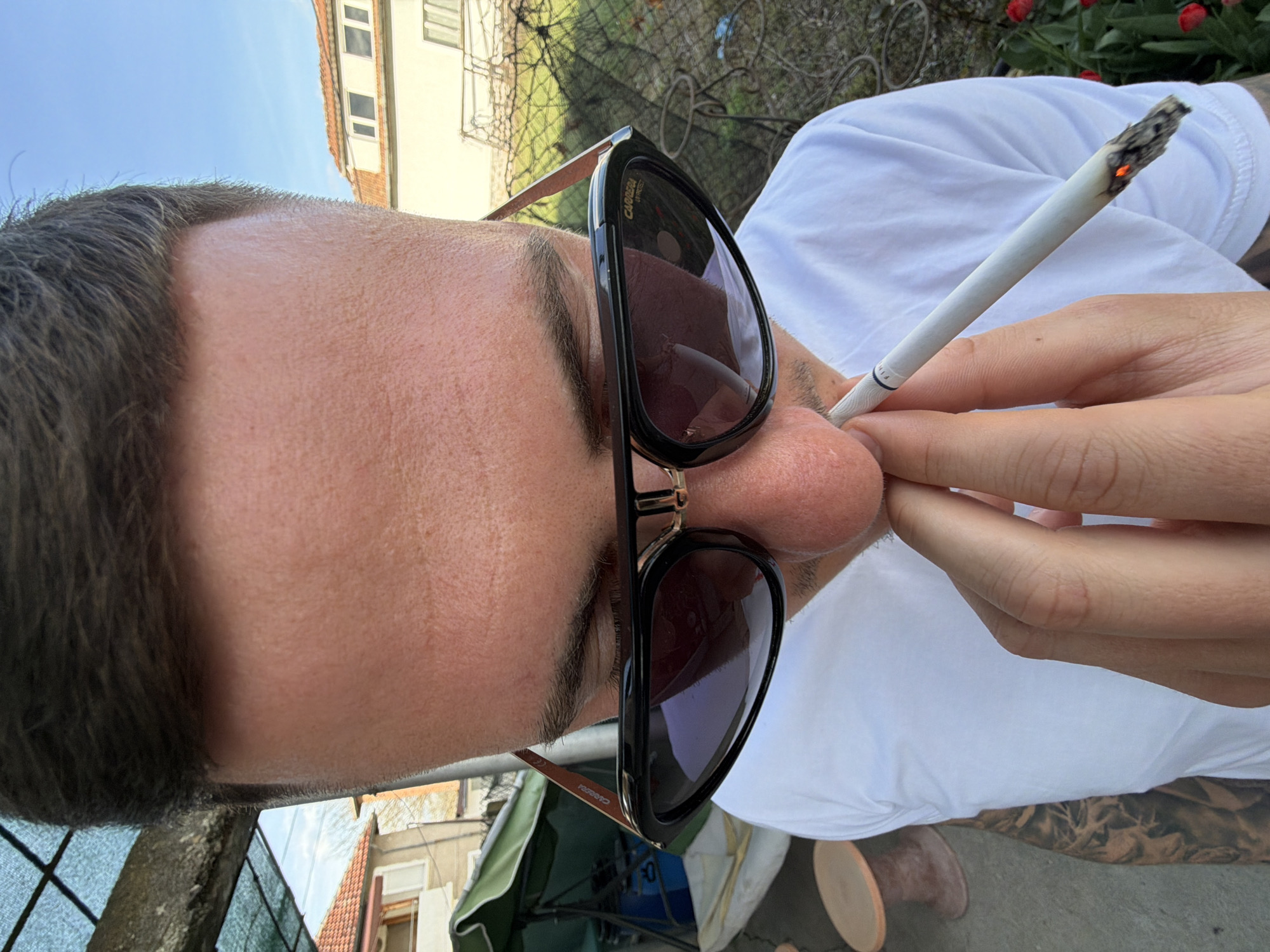 A close-up, slightly tilted shot features a man holding a lit cigarette between his lips and fingers. He is wearing black Carrera sunglasses with gold accents. He has dark hair and light skin. The man is wearing a white t-shirt. His tattooed arm is visible. The background includes foliage, tulips, a building, and a fence. The location may be Damianitsa, Bulgaria.