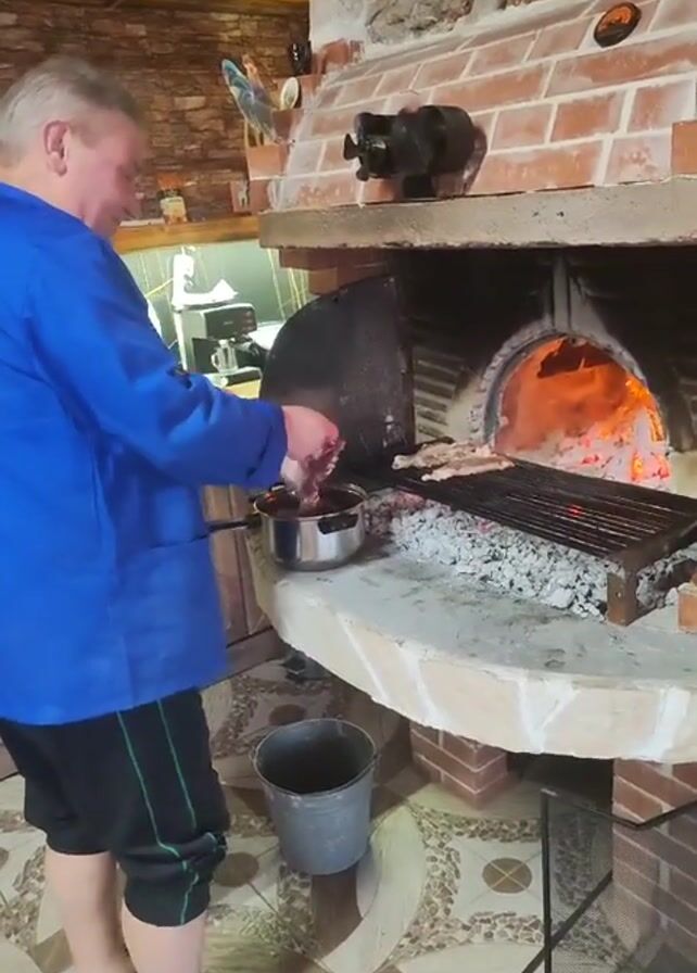 A man wearing a blue jacket, black shorts with green trim, and gray Crocs is grilling meat. He stands in front of a large brick fireplace and grill area. The fireplace is lit with a fire burning inside. The man transfers pieces of meat from a stainless steel pot onto the grill, which is already holding several pieces of meat. A metal bucket is on the floor next to him, and a metal screen stands between him and the fire. The background includes kitchen equipment, a tiled floor, and a wooden ceiling. At one point, the man turns towards the camera and smiles.