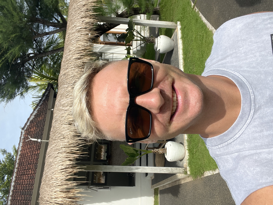 A man with blond hair smiles wearing sunglasses outside a building with a thatched roof. Behind him is a green lawn and potted plants. The building is painted white and has wooden pillars. The man is wearing a light grey t-shirt. The image is taken from a slightly elevated angle.