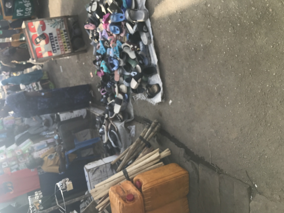 The scene depicts a bustling outdoor market environment in Jos, Nigeria, during daylight hours. The ground consists of uneven greyish-brown pavement and packed dirt. In the left foreground, three orange plastic jerry cans with red caps are stacked vertically, accompanied by a bundle of light-colored wooden sticks secured with dark bands. In the mid-ground, multiple piles of assorted sandals and slippers are displayed directly on white fabric sheets spread across the ground. The footwear varies in color and style, including black, white, blue, pink, brown, and grey slides and open-toed sandals. To the left of the footwear display, a male individual wearing a yellow t-shirt and dark pants is seated on a blue plastic chair, appearing occupied with items in front of him. Behind him, market stalls with various merchandise, including a red fabric item, are visible. Another individual in light clothing is partially visible in the background. To the right of the footwear display, a mobile Point of Sale (POS) kiosk on wheels features signage indicating services such as "DEPOSIT CARDS," "TRANSFER," and "PAY BILLS," along with an image of a mobile phone. A female figure in a long, dark patterned dress stands upright nearby. Further in the background, part of a motorized rickshaw (Keke Napep) with registration "PT-X 16248" is visible, along with other blurry figures, one wearing a light blue head covering.