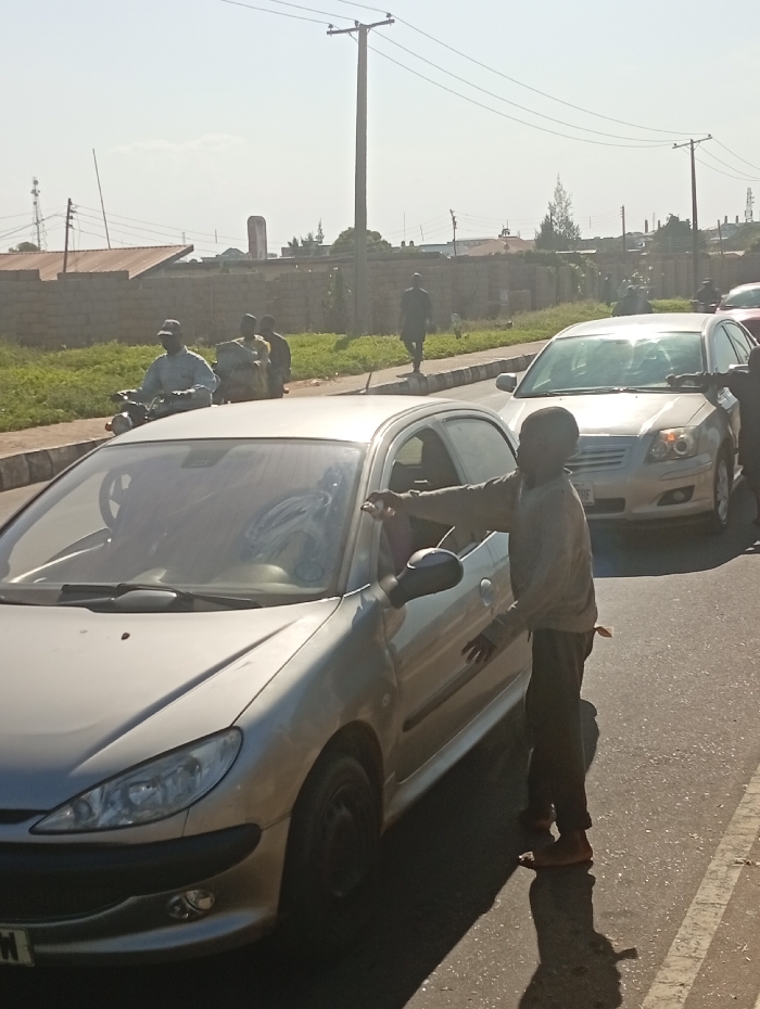 The image displays a bright, sunny daytime urban street scene on Independence Way in Kaduna, Nigeria, featuring the Kaduna War Memorial/Cenotaph prominently visible in the mid-background. In the immediate foreground, a young dark-skinned male, wearing a light-colored long-sleeved shirt and dark trousers, stands adjacent to the open passenger window of a stationary silver two-door Peugeot vehicle. His right arm is extended into the car's interior, while his left hand rests near the door, indicating an interaction with the occupant or the vehicle itself. He is either barefoot or wearing minimal footwear, casting a distinct shadow on the asphalt. Behind the Peugeot, a silver Toyota sedan, identifiable as an Avensis model, is stopped in what appears to be traffic. Further in the mid-ground, to the left, a male in a light cap operates a motorcycle, transporting at least two passengers, one of whom is largely covered by fabric. A lone male pedestrian in dark clothing walks on the roadside beyond the stopped vehicles. The environment consists of an asphalt road with a visible white lane demarcation line. A low brick wall runs parallel to the road, behind which various single and two-story structures with light-colored walls and some reddish-brown roofs are visible. The tall, slender, light-colored obelisk-like structure in the mid-background is the Kaduna War Memorial/Cenotaph. Numerous wooden utility poles with overhead power lines traverse the clear, hazy sky. Strong shadows are cast across the road and subjects, consistent with direct sunlight.