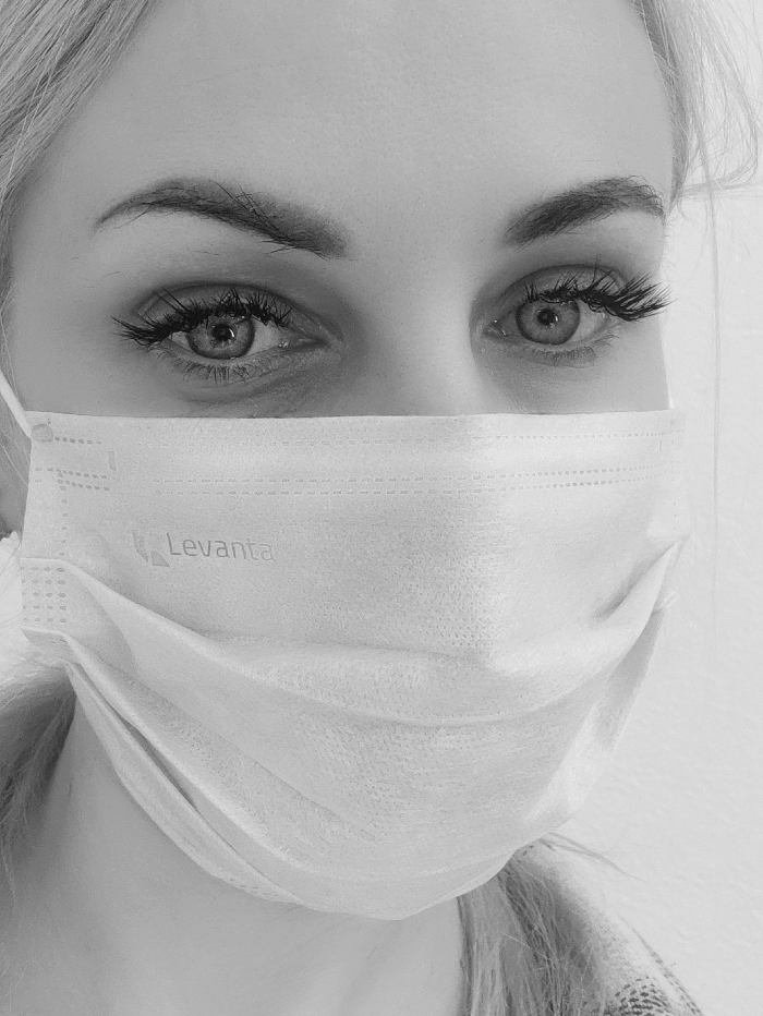 A black and white, close-up photograph depicts the upper portion of an adult individual's face, likely female, wearing a light-colored disposable surgical mask. The mask covers the nose and mouth, extending from below the eyes to the chin. The word "Levanta" with a small logo is visible on the upper left side of the mask. The individual's eyes are visible, appearing light in color, with prominent eyelashes. Eyebrows are dark and shaped. Light-colored hair is visible at the top and sides of the frame. The subject is looking directly towards the camera. The background is uniformly light-colored and out of focus, providing no specific environmental context. The specific location within Sevastopol, Ukraine, is not discernible from the image.