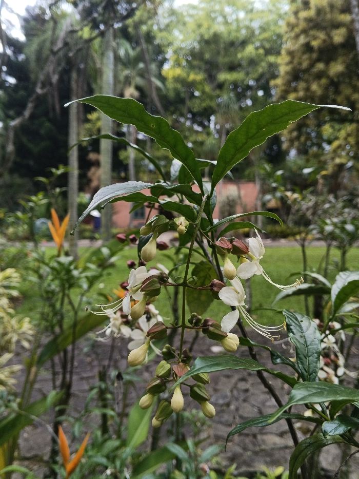 The image presents a close-up of a flowering plant in a garden environment located in Trairão, Brazil. The central subject is a plant displaying dark green, elongated leaves with undulating margins. Numerous white, trumpet-shaped flowers, each featuring prominent, elongated white stamens, are visible in clusters. Alongside the open flowers, multiple pale green, tear-drop shaped buds and developing seed pods, some partially encased by reddish-brown calyces, are present on the same plant. To the left of the main plant, a partial view of another plant with bright orange, upright, bird-of-paradise-like inflorescences is discernible. The ground beneath the immediate flora consists of irregular grey stone paving. The background is out of focus, revealing a dense, verdant landscape characterized by various trees, including tall palm-like structures. A reddish-brown building with a dark, rectangular opening is visible in the mid-left background, with a faint, blurred human figure discernible near it.