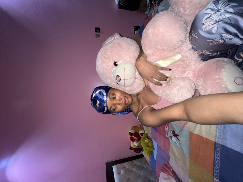 - "A young woman with a blue headscarf lies on a colorful, patterned bed, hugging a large pink teddy bear" by FM-lhD7u1, licensed under CC BY 4.0
