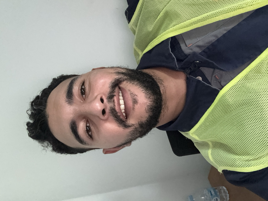 The image captures a close-up, chest-up view of an adult male in an indoor setting in Douyet, Morocco. The subject has dark, curly hair with visible grey strands, a full dark beard, and dark brown eyes, and is depicted with a broad smile revealing his upper and lower teeth. He is wearing a dark blue collared work shirt, partially visible beneath a bright fluorescent yellow-green mesh safety vest. The background consists of a plain white wall. To the subject's left, a wooden or laminate surface is partially visible, on which a clear plastic water bottle with a blue cap and a white label (featuring Arabic text) rests. A dark-colored chair back is present behind his left shoulder.