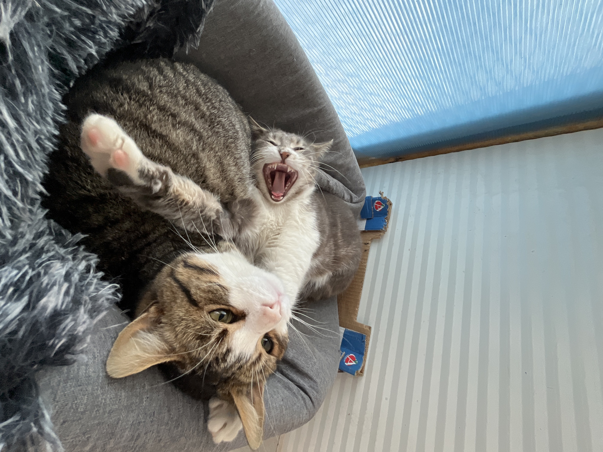 Two cats are in a gray cat bed, inside a building. The larger cat is in the bottom left with its head tilted and paw raised. The smaller cat, partially overlapping the larger cat, is yawning, its mouth open wide, displaying visible teeth. The building's interior wall behind the cats is white with light gray vertical stripes. The ceiling has translucent blue corrugated plastic. There is no indication of this being in Shumen, Bulgaria.
