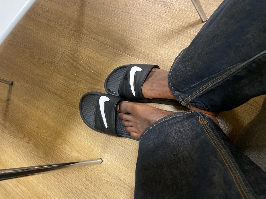 A person wearing dark denim jeans and black Nike slides sits on a light brown wooden floor. The slides have a white Nike swoosh on them. The person's feet are visible in the slides. Parts of the legs of chairs or a table are also visible on the floor.