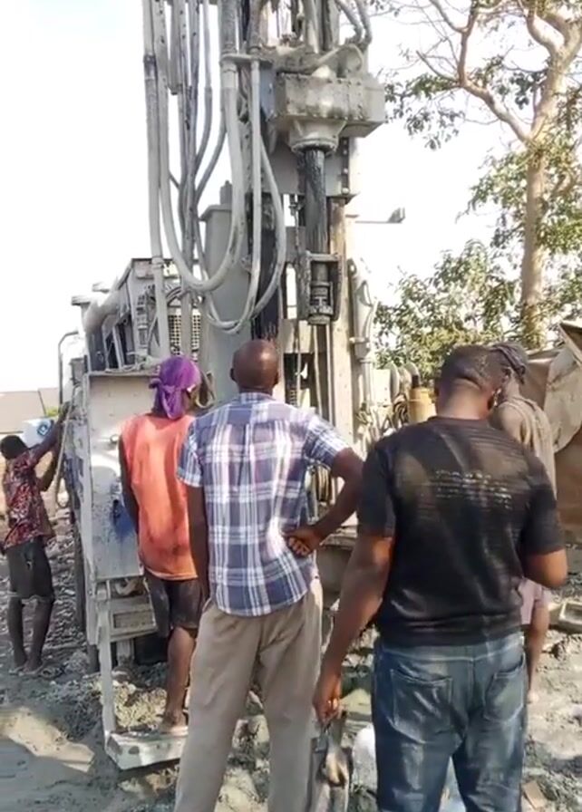 group of men standing around a large drilling machine on a muddy, possibly construction, site. The machine is tall and has many pipes and hydraulic components. It is drilling into the ground. The men are watching the drilling process. Some are wearing casual clothes such as jeans and t-shirts while others are wearing vests and head coverings. There is a tree visible in the background.