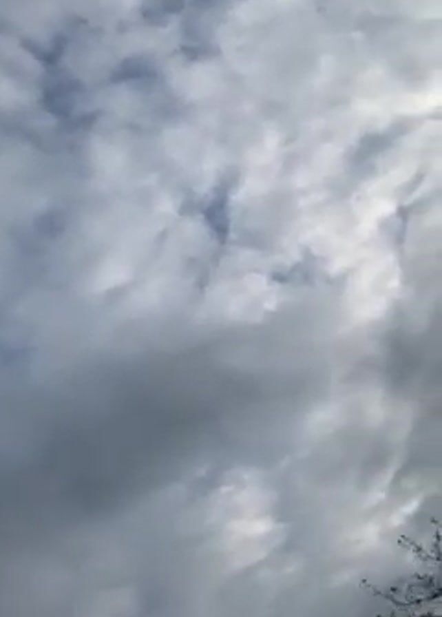 - "cloudy sky. The clouds are gray and white, and they are moving quickly. The camera pans down to reveal a line of trees and a body of water in the distance. The sound of wind is audible." by FM-mRKYr2, licensed under CC BY 4.0
