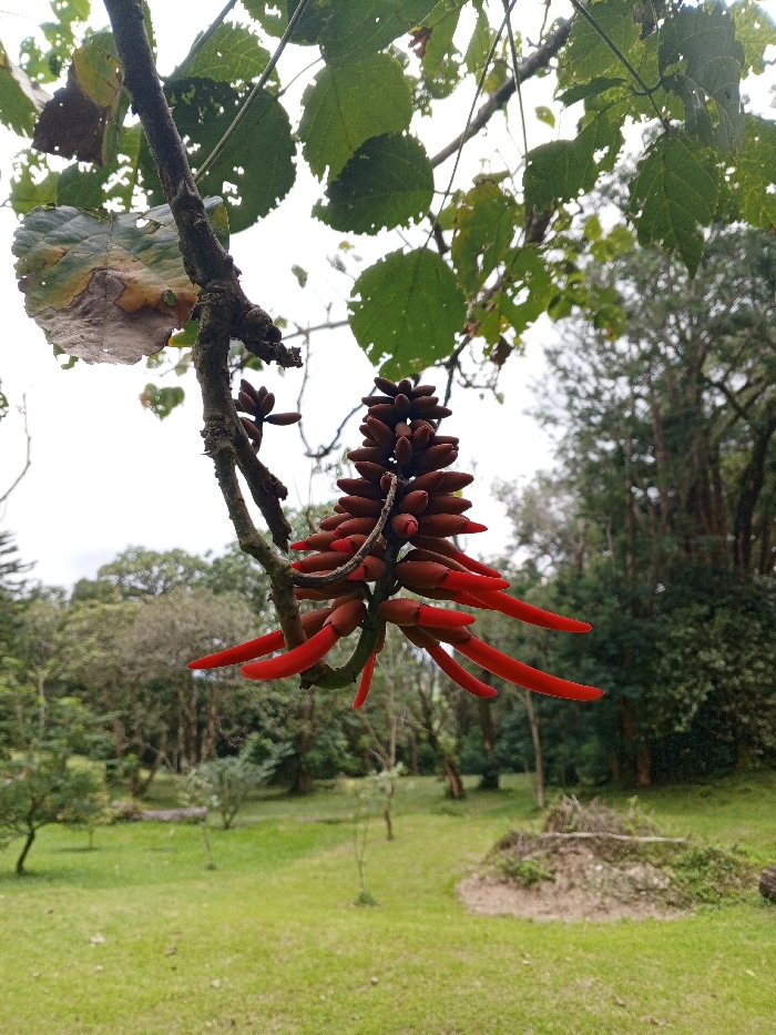 A cluster of vibrant red flowers hangs from a tree branch, contrasting with the brown buds at the top